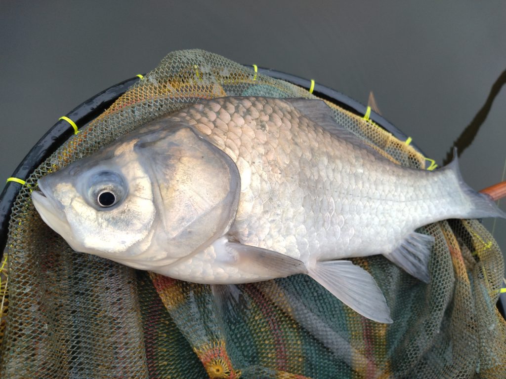 枯草色を覆う雪景色。氷の時まであとわずか。11月も下旬となり、朝の冷え込みが強まりました。岸際はシャーベット状になっているところも・・・。気温がやや高まる昼頃からの釣行、寒さ対策を整えて準備にとりかかります。 水に手を入れると指先がしびれるほど冷たくなり、非常に澄んだ水色は、この時季特有の魅力を発します。エサを打ちはじめて1時間、ウキの動きに変化なく、空が鈍色に変わり少しずつ体が冷えてきて、「流石に当たらないか?」と諦めかけたころ、ほんの僅か「フッ」っとウキに変化が!合わせが決まってタモに収まったのは、尺サイズの良型でした。